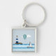 Metal keychain available to customize with a nautical scene of a sailboat sailing in a wavy ocean with a hot air balloon above floating passed a lighthouse.
