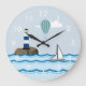 Round wall clock with nautical scene of a sailboat sailing in a wavy ocean passed a lighthouse with a hot air balloon floating in the sky above.