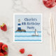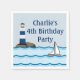 Personalized Children's Birthday cocktail napkins with digital nautical scene of a sailboat sailing in a wavy ocean passed a stripey lighthouse.