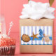 Original watercolor painted design by Sandra Gale, featuring star fish, sea horse, turtle and shells on a background of vertical translucent blue stripes. Great design for the summer, beach homes, bungalows or for anyone who loves the beach, ocean or fish.