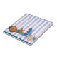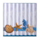 Original watercolor painted design by Sandra Gale, featuring star fish, sea horse, turtle and shells on a background of vertical translucent blue stripes. Great design for the summer, beach homes, bungalows or for anyone who loves the beach, ocean or fish.