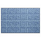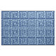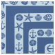 This nautical, beach house theme fabric has a simple, modern look with a geometric Greek Key pattern. Its pretty, decorative, stylized design includes silhouettes of shells, starfish, anchors and sand dollars, all in light blue on dark blue. The design has an elegant yet minimalist mod feel.