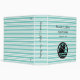 This stylishly elegant art deco nautical design features a black cruise ship with robin egg blue sky and ocean in a black and white frame on a light robin's egg blue and white striped background.