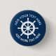 Nautical ship wheel pinback buttons with custom text. Blue and white boat helm logo with curved text template. Fun party favor supplies and accessories for Birthday party, beach destination wedding, bridal shower, baby shower, retirement etc. Add your own name or funny quote. Create your own round name badges with maritime theme. Also nice for boat captain on sailing / boating trips. Change quantity to get the cheap bulk price.