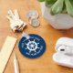 Nautical ship wheel keychains with custom text. Navy blue and white boat helm logo with curved text template. Fun party favor supplies and accessories for Birthday party, beach destination wedding, bridal shower, baby shower, retirement etc. Add your own name or funny quote. Create your own round button key chain with maritime theme. Also nice for boat captain on sailing / boating trips. Change quantity to get the cheap bulk price.