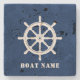 Nautical Ships Wheel Helm & Your Boat Name on Blue Stone Coaster