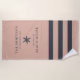 Nautical beach towel features a coastal style starfish and stripes design. Personalize the custom text with a family last name and beach house (or other title) with the year established and location. Hale navy blue and smoky salmon color scheme.