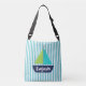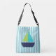 Allover print tote bag with a bright and fun nautical stripe design of blue and white with sailboats on front and back of blue, aqua, and green with an area you can add a name to personalize it!