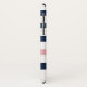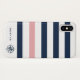 Nautical phone case with stripes in various colors of teal, navy blue, coral and gold with compass at the bottom and your own monogram