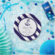 The design features a whimsical navy blue anchor motif on a nautical navy and white striped background.