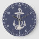 Handsome nautical themed wall clock done in navy blue, with vintage artwork of a ivory colored ship's anchor. Ivory colored hour numbers and minutes runs around the outside edge. Customize to add any text to this stylish clock.