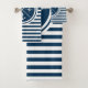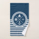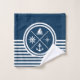 Nautical themed design with nautical symbols (anchor, sailing boat, sailing wheel, compass) decoration on white and navy blue striped background.