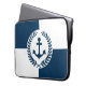 Nautical themed design with anchor and laurel wreath decoration over blue and white geometric background