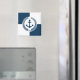 Nautical themed design with anchor and laurel wreath decoration over blue and white geometric background
