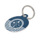 Nautical themed design with nautical symbols (anchor, sailing boat, sailing wheel, compass) decoration on white and navy blue striped background.