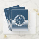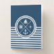Nautical themed design with nautical symbols (anchor, sailing boat, sailing wheel, compass) decoration on white and navy blue striped background.