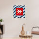 Nautical themed design with sailing wheel decoration in square on blue and white striped background