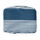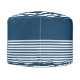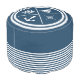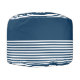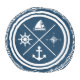 Nautical themed design with nautical symbols (anchor, sailing boat, sailing wheel, compass) decoration on white and navy blue striped background.