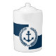 Nautical themed design with anchor and laurel wreath decoration over blue and white geometric background