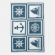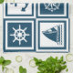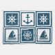Nautical themed design with sailing wheel, sailing boat,compass and anchor decoration in white and blue striped squares