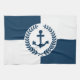 Nautical themed design with anchor and laurel wreath decoration over blue and white geometric background