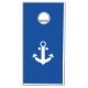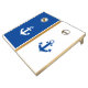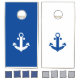 A minimal, stylish, and fully customizable cornhole set with a classy nautical theme. It features a set of anchors on each side and a vibrant navy and white color scheme. Inside the striped pattern area is a white circle around the holes marking them an extra easy-to-find target for your bean bags. All elements are unlocked and adjustable so have fun being creative and making it your own.