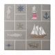 Nautical themed illustration with sea horse, sailing boat, sailing wheel, anchor, lighthouse, fish, seashell, starfish and compass decoration in rectangles on grunge sandy background