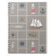 Nautical themed illustration with sea horse, sailing boat, sailing wheel, anchor, lighthouse, fish, seashell, starfish and compass decoration in rectangles on grunge sandy background