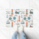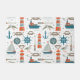 Red, teal, gray nautical graphics on white background, seamless repeat pattern