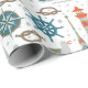 Red, teal, gray nautical graphics on white background, seamless repeat pattern