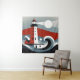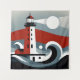 This tapestry presents a modernist vision of a lighthouse, where geometric shapes and bold colors converge to create a minimalist nautical scene. The composition is striking in its simplicity, with a stylized red and white lighthouse standing against the backdrop of a moonlit sea. Abstract waves, rendered in curves and lines, evoke a calm yet rhythmic ocean, suggesting the peaceful passage of time under the watchful gaze of the beacon. The play of light and shadow, along with the restrained color palette, contributes to a sense of serenity and contemplation. This artwork is perfect for a contemporary setting that values clean lines, abstract beauty, and a modern take on classic maritime themes.