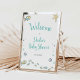 This darling baby shower welcome sign features a cute under the sea theme with turquoise and black text.