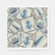 A beautiful illustration collage of squares set at different angles and sizes in which a ships wheel, a lighthouse, an anchor with rope wrapped around it, an old world atlas map and a sailing ship appear. Each square is framed in dark grey, powder sea blue and beige.