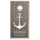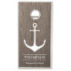 Nautical custom family or wedding monogrammed cornhole game set features a coastal style with an elegant black boat anchor and stripe-accented monogram text that can be personalized with a last name and location in italicized print. A warm gray faux wood grain background adds a rustic textured look to the design.