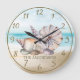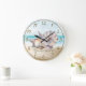 Add a relaxing coastal or island vibe to your home with this nautical wall clock featuring a watercolor painting of the ocean and white sand beach with seashells. Easily personalize it with your own desired text (or if you prefer, you can remove the text).