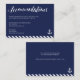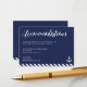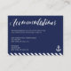 Nautical wedding accommodations business cards with navy blue and white stripes, white anchor and custom white text printed on navy blue background