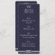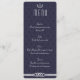 Nautical wedding menu with white anchor and white text printed on navy blue background with anchor pattern