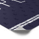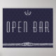 Nautical Open Bar wedding reception sign (poster) with white anchir and customizable white text, printed on navy blue background and anchor pattern. Dimensions of the sign print (poster) are 14 inches by 11 inches.