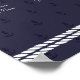 Nautical wedding seating chart with with white anchor and customizable white text - you can add bride's and groom's name, wedding date and guest's names, printed on navy blue background with anchor pattern.