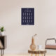 Nautical wedding seating chart with white anchor and customizable white text - you can add bride's and groom's name, wedding date and guest's names (15 tables for 10 guest at each table), printed on navy blue background with anchor pattern. Dimensions of the sign print (poster) are 18 inches by 24 inches (vertical).