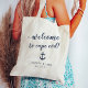 Welcome guests to your destination wedding with these chic and modern personalized tote bags. Design features "welcome to [your destination]" in modern navy blue hand lettered brush script, with space to personalize with your names and wedding date. A small nautical anchor silhouette illustration completes the design.