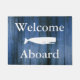 Nautical doormat saying "welcome aboard" in white text featuring blue wooden planks and a nautical whale silhouette in white.