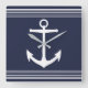 Navy blue and white stripes white anchor silhouette square wall clock.