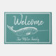 Cute nautical themed doormat featuring a white narwhal illustration over ocean green and your personalized family name.