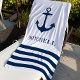 Personalized nautical beach towel features a simple, stylish navy blue and white coastal stripes design with boat anchor. Personalize the custom monogram text with a first or last name.