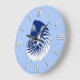 Digital sketch of a striped nautilus shell - dark navy blue and white shell against a light chambray blue background