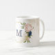 Beautiful coffee mug featuring navy and blush pink flowers and green leaves.