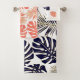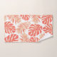 Modern navy blue and coral tropical leaves and monogram Bath Towel Set. A lovely design that features monstera and palm leaves in navy blue and living coral with gold outline. The wash cloth includes a coral leaf and your monogram in a navy blue frame.