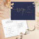 A simple, elegant gold heart script on a navy blue background RSVP card. The reverse features your details and a fun guest song request. Designed by Thisisnotme©