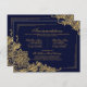 Elegant gold lace over navy background with monogram formal accommodations or details card.